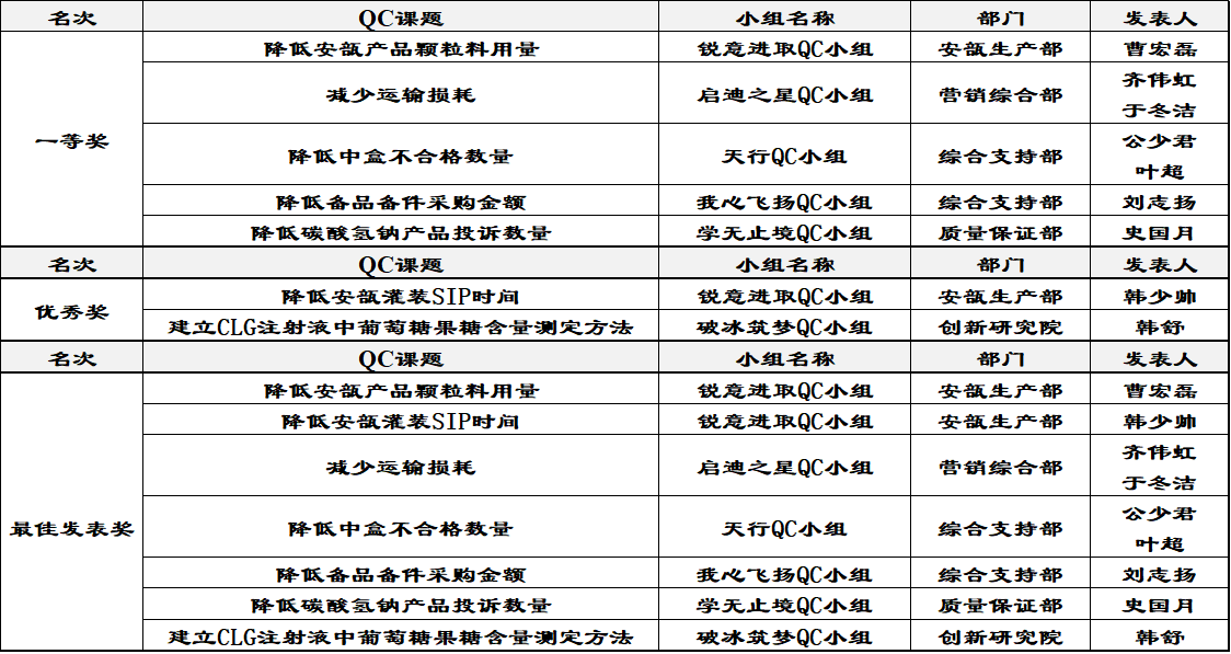 今年QC小組活動在公司各部門的大力支持和共同參與下共推選出7個課題參與此次市級交流活動,并取得了5個一等獎、2個二等獎、7個最佳發表獎的良好成績。同時,公司連續三年獲得了天津市醫藥行業優秀QC小組活動成果——優秀組織獎。